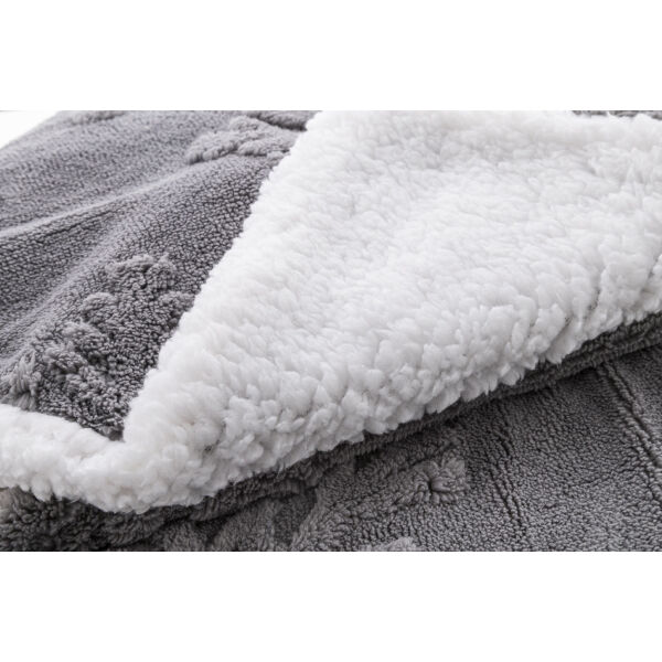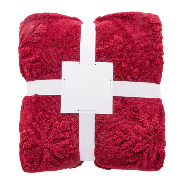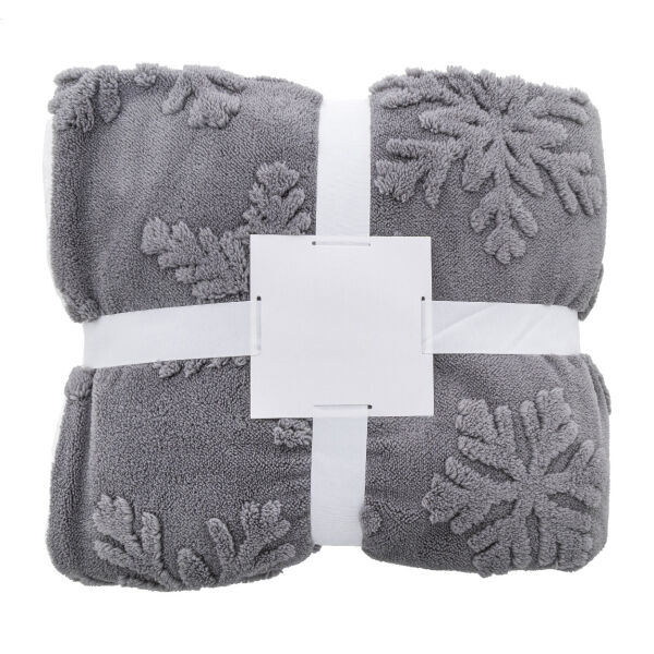 Luxe dubbellaags RPET kerstdeken met jacquard sneeuwvlokpatroon. Met 260 g/m² RPET koraalvlies en omkeerbare 210 g/m² RPET sherpa fleece voering. Verpakt met lint en printbare papieren kaart.