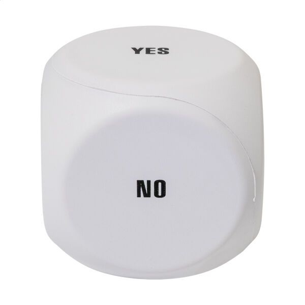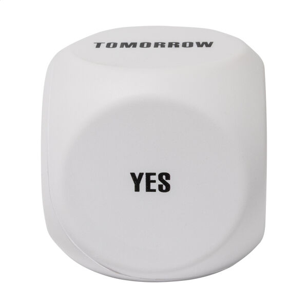 Dobbelsteenvormige, beslisser antistressbal in PU-schuim. Inclusief de volgende berichten: Take a break, Tomorrow, Maybe, Yes, No en een lege kant om te bedrukken.