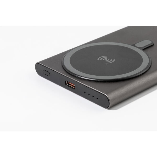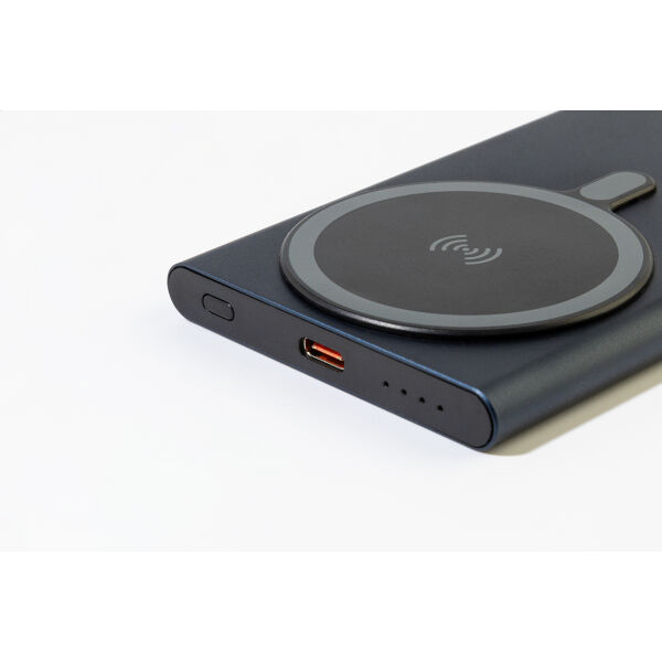 Powerbank van gerecycled aluminium met ingebouwde magnetische draadloze snellader (15 W) en 5000 mAh batterij. Met USB-C-ingang en oplaadpoort. Inclusief zelfklevende metalen ring om de magnetische functie op elk draadloos oplaadbaar apparaat te gebruiken. Compatibel met iPhone® 12 of nieuwer. Inclusief USB-oplaadkabel.